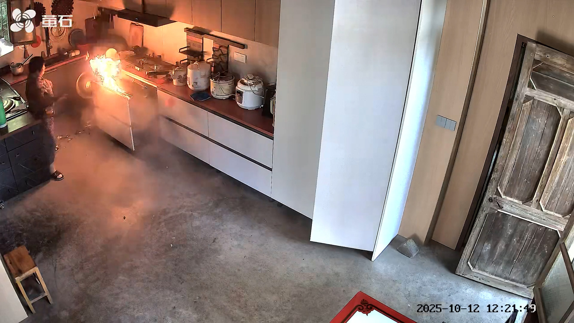 Surveillance footage shows flames bursting from the cooker, but the pensioner reacts swiftly and without panic.