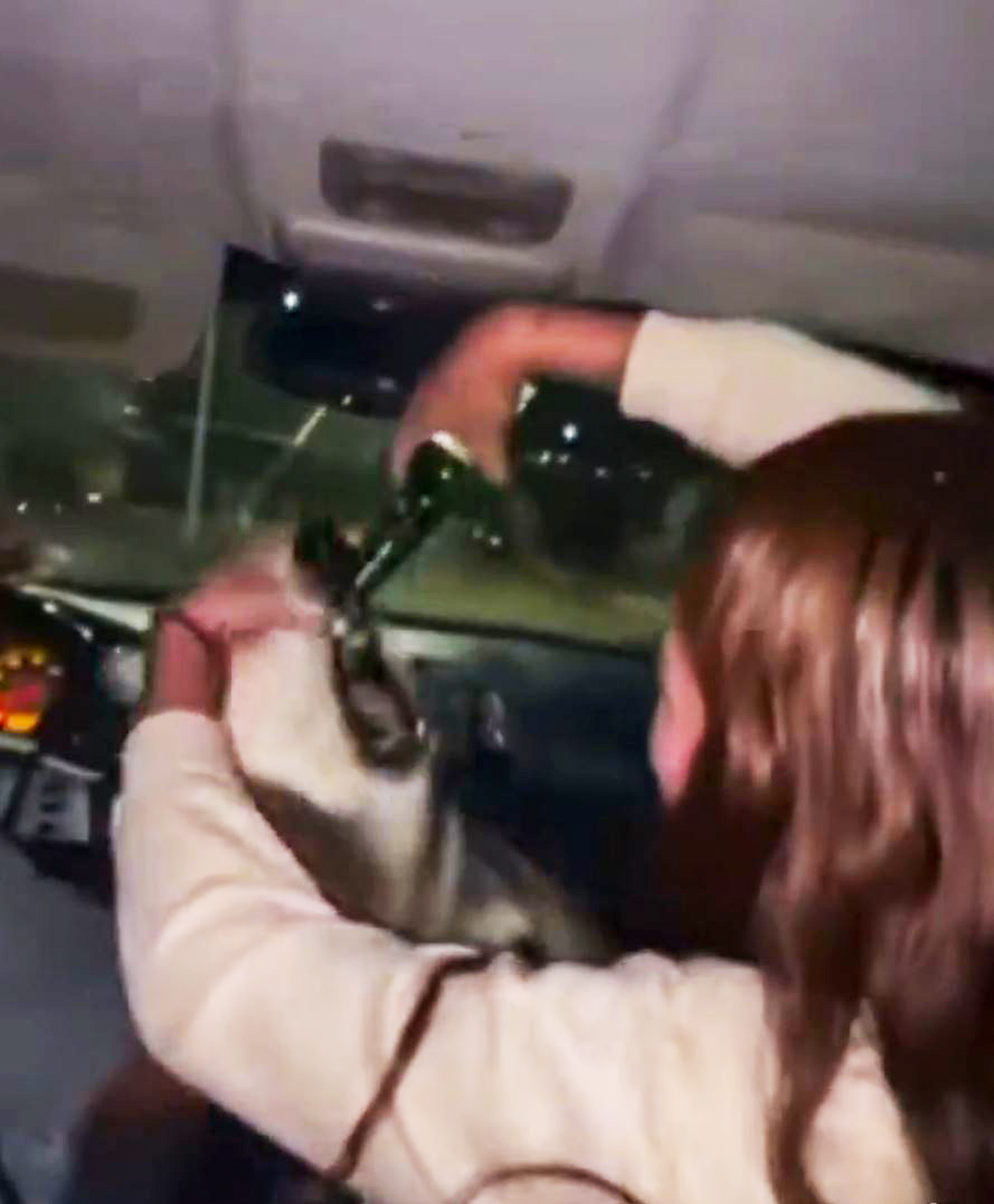 The footage shows the woman inside the vehicle as she holds down the animal and pours beer into its mouth.