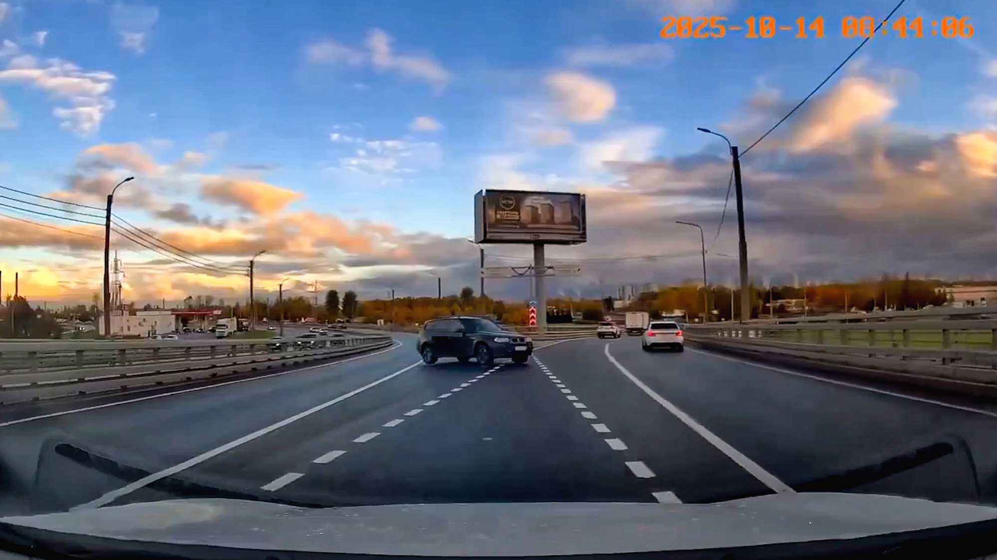 This is the moment a BMW spins 360 degrees across lanes right in front of another car before the driver rights the vehicle and continues on their way.