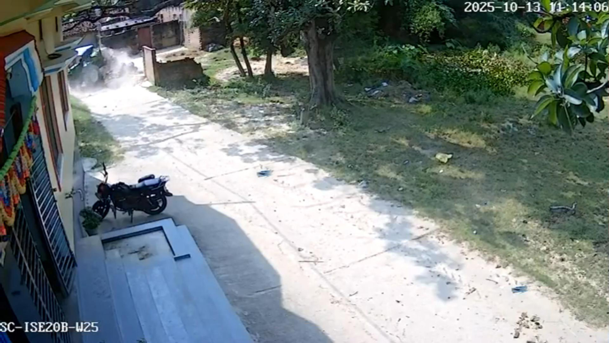 CCTV footage shows the tractor coming at full speed as the driver struggles to control it before it smashes through a boundary wall in a narrow lane.