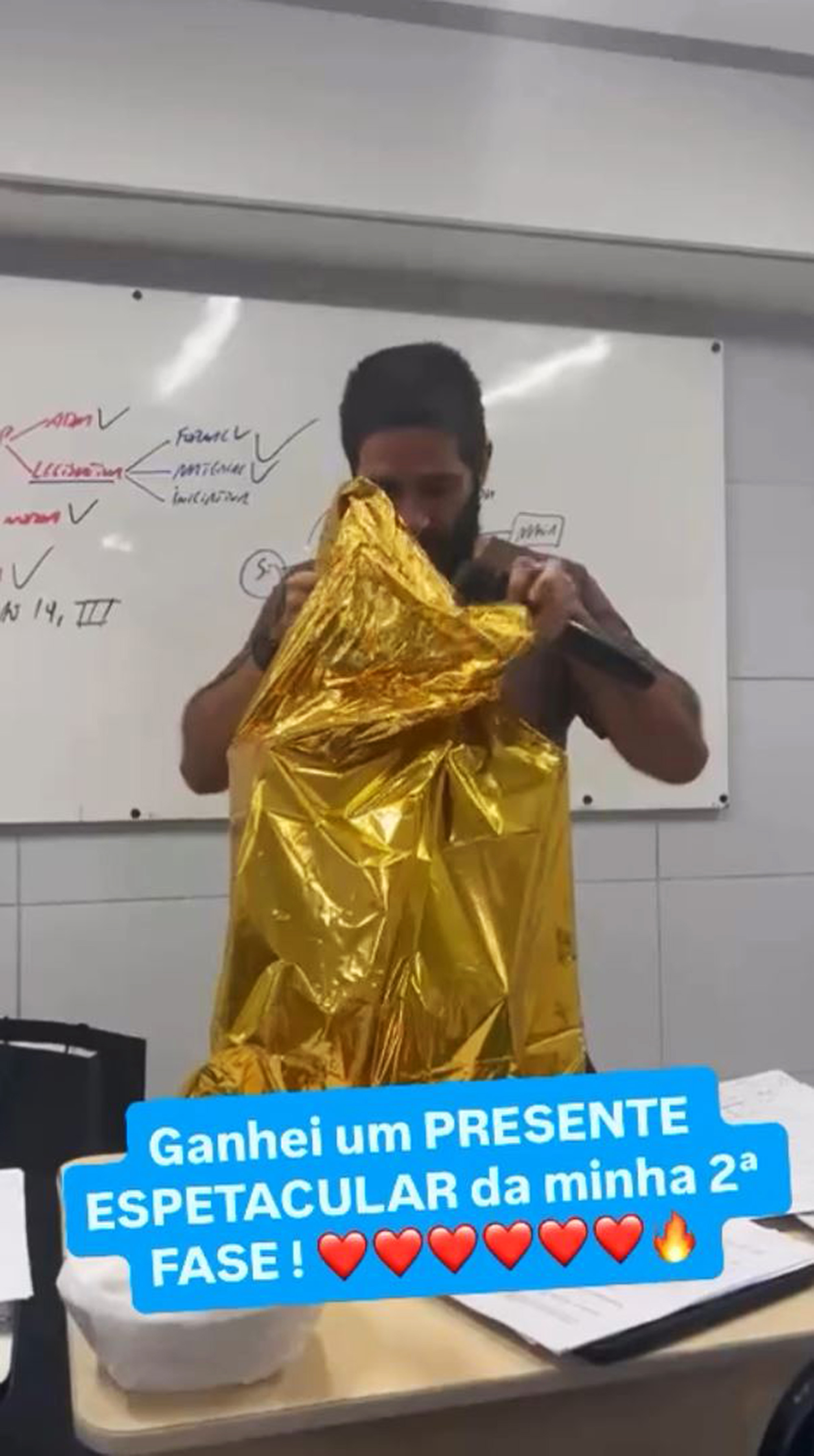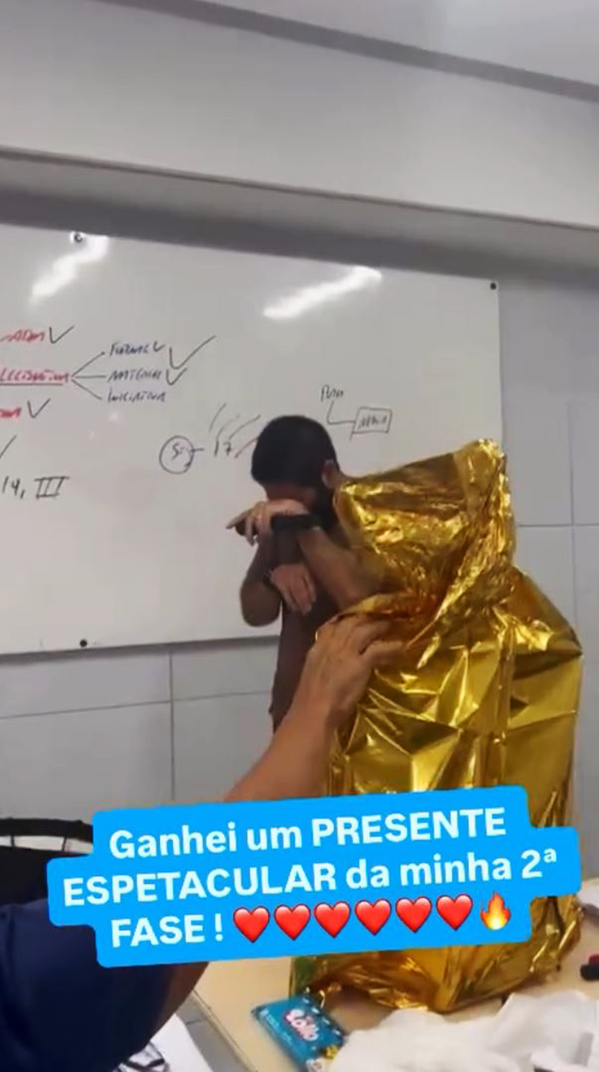 The footage shows the moment the professor unwraps the box while his students applaud and record the surprise.