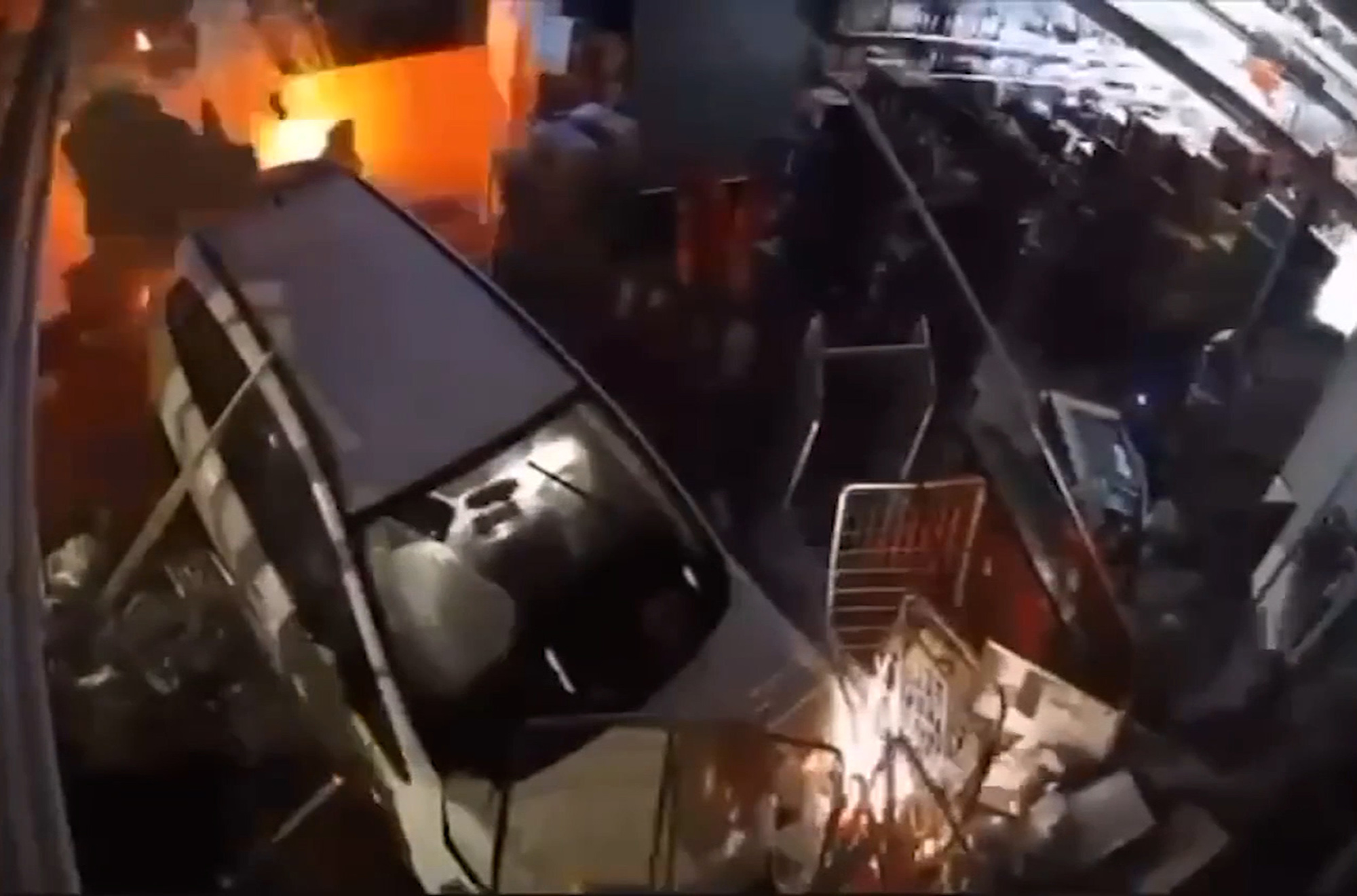 Moments later, the vehicle came from the opposite lane at high speed, lost control on the roundabout, and smashed through the glass window of a grocery shop, coming to a halt inside.