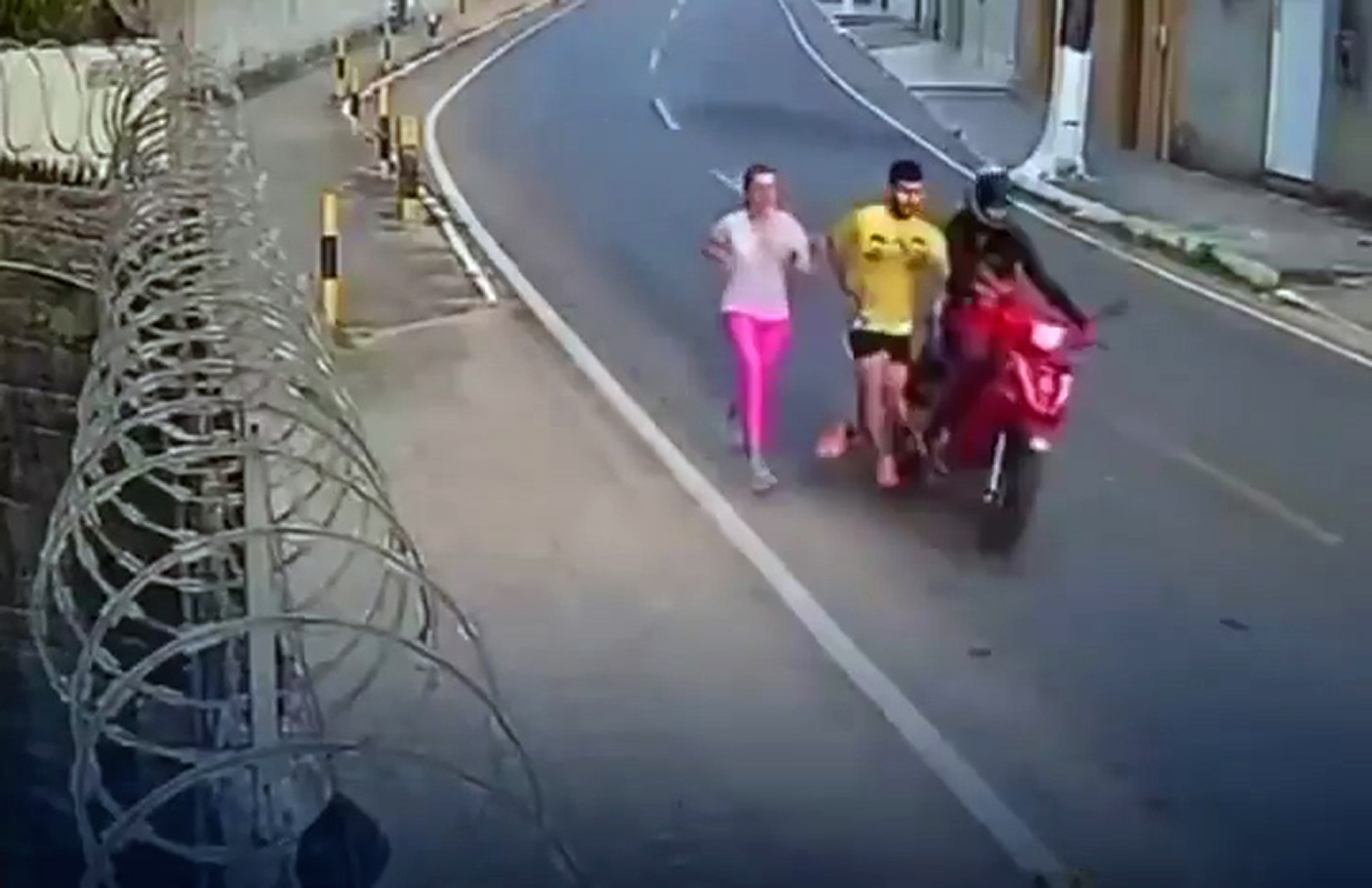 The footage shows the man running next to a woman in a yellow shirt when a red motorcycle strikes him at speed, instantly knocking him to the ground and apparently causing him to hit his head.